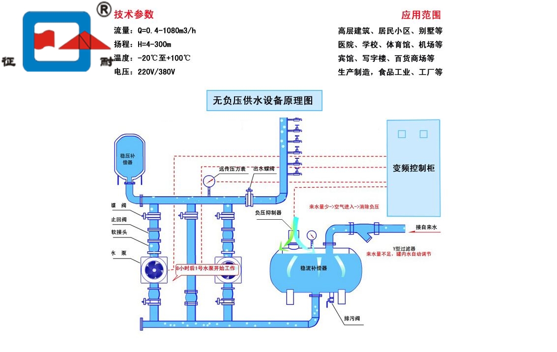 CZWG智能無負(fù)壓供水設(shè)備是集 水力學(xué)、機(jī)械性能、智能化變頻節(jié)能控制、遠(yuǎn)程監(jiān)控、穩(wěn)流防負(fù)壓技術(shù)于一身,具有節(jié)能、環(huán)保、衛(wèi)生、占地面積 小、經(jīng)濟(jì)實(shí)惠的變頻節(jié)能無負(fù)壓管網(wǎng)增壓穩(wěn)流給水設(shè)備。該設(shè)備按照國家標(biāo)準(zhǔn)GB/T26003-2010生產(chǎn),廣泛用于各 種高層樓宇、小區(qū)、大型賓館、商場以及工礦企事業(yè)單位的無污染的二次供水。