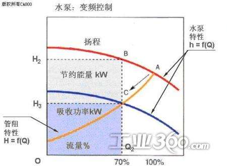 ②由于某些大型循環(huán)水泵的規(guī)劃參數(shù)而被適應于某些循環(huán)水泵系統(tǒng),即所謂的“大馬拉小車”,它在這種情況下具有一定的作用,依賴于泵的頻率來改變泵馬達的頻率降低泵的轉(zhuǎn)速,調(diào)整泵的Q和H值,并使泵的實際流量值低于泵的額外流量值,以達到節(jié)能的目的。