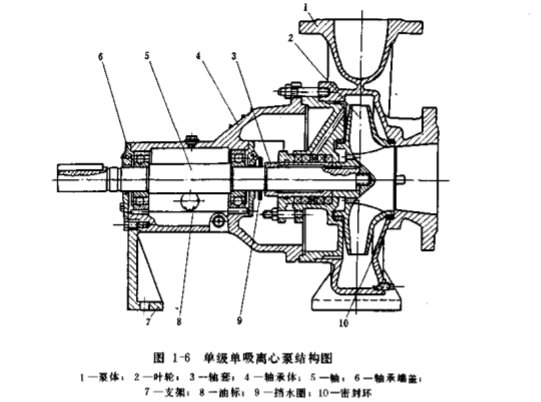單級單吸離心泵常為臥式,它的結(jié)構(gòu)如圖1-6所示。由葉輪、泵體、泵軸和軸承、軸封等主要部分組成,現(xiàn)分述于下。