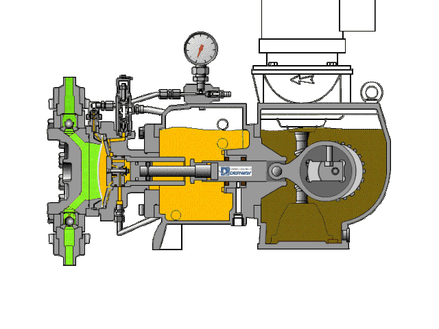 隔膜泵的缸蓋主要由隔膜隔開,以將待輸送的液體與工作流體分開。當隔膜移動到傳動機構的一側(cè)時,泵缸中的工作室會在負壓下抽吸液體。當隔膜移動到另一側(cè)時,然后排出液體。待輸送的液體通過泵缸中的隔膜與工作流體分離,并且僅與泵缸,吸入閥,排放閥和隔膜的內(nèi)側(cè)接觸,而沒有與柱塞和密封裝置接觸,因此重要部件例如塞子完全在含油介質(zhì)中工作,并且可以處于良好的工作狀態(tài)。下圖顯示了隔膜泵的工作狀態(tài)。